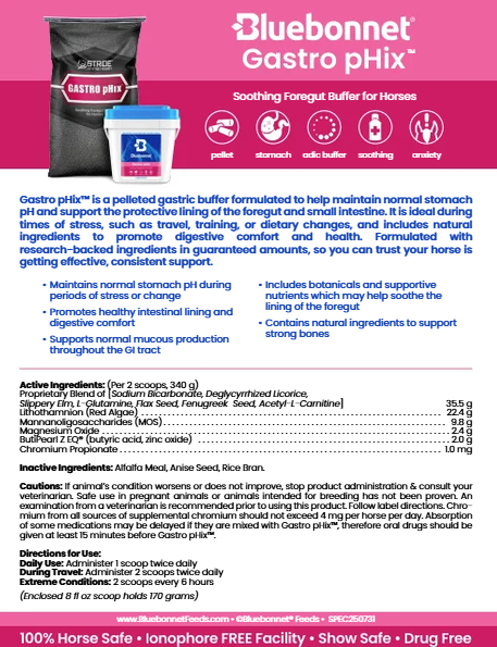 Gastro pHix™ is a pelleted gastric buffer formulated to help maintain normal stomach pH and support the protective lining of the foregut and small intestine. It is ideal during times of stress, such as travel, training, or dietary changes, and includes natural ingredients to promote digestive comfort and health. Formulated with research-backed ingredients in guaranteed amounts, so you can trust your horse is getting effective, consistent support.