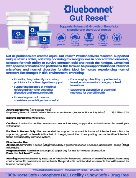 Gut Reset™ Powder delivers research-supported unique strains of live, naturally occurring microorganisms in concentrated amounts, selected for their ability to survive stomach acid and reach the hindgut. Combined with specific prebiotics and postbiotics, this formula helps support balanced intestinal microflora and normal digestive function. Ideal for horses experiencing normal stressors like changes in diet, environment, or training.